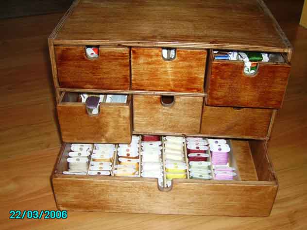 Таких комодиков для хранения ниток две штуки! Еще летом шкурила их и лакировала:) Теперь оба почти заполнены. Боюсь потребуется третий:) 22 марта 2006 г.