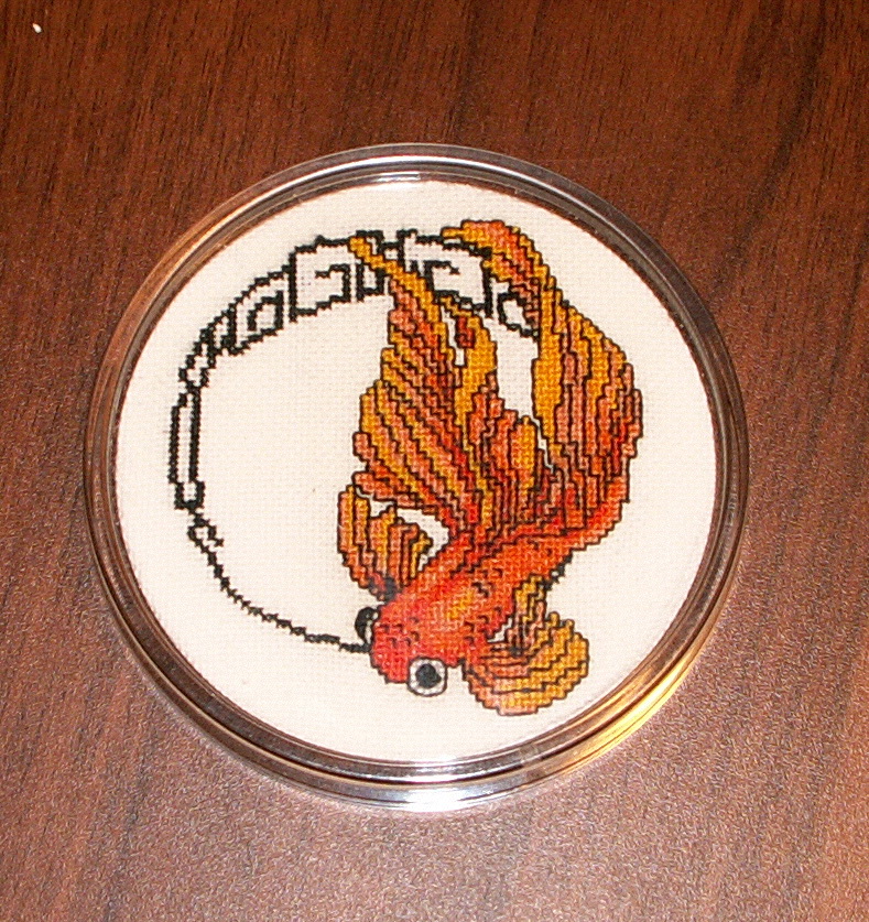 Подстаканник для себя, то бишь рыбины. Давно понравился дизайн, но вроде бы некуда было пристроить. Потом "осенило" с подстаканником. И когда около трети было вышито, Грей предложил аналогичный вариант для шкатулки. Чес-слово, сама придумала!