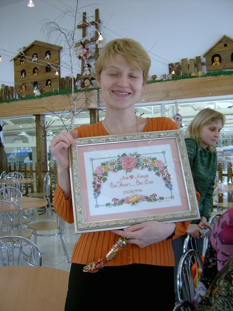 А вот и сама Ненка. Она хвастается своим подарком к круглой дате своей же свадьбы, и так он ей нравится, как, впрочем, и всем нам. Здорово смотрится рисунок на канве с блеском, просто БЛЕСК, ну не могу подобрать другого слова. А закрыла глаза Аня, я так думаю, что от удовольствия, потому что нам вручали подарки и в руке у Ненки как-раз один из них. Еще Ненка показала нам косметичку и зеркальце, милые вещицы, которые так и хочется заполучить в подарок:)))10 апреля 2006 г.