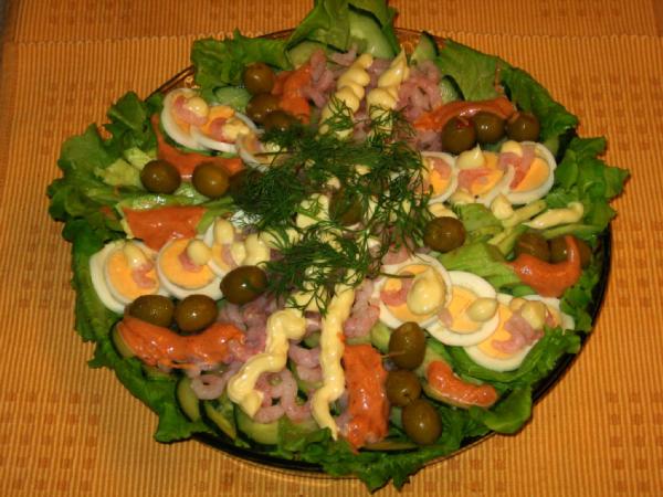 На листья салата выложить: отварные и нарезанные на кружочки яйца. Свежий огурец, авокадо, креветки. украсить оливками, зеленью,майонезом или другой салатной заправкой.