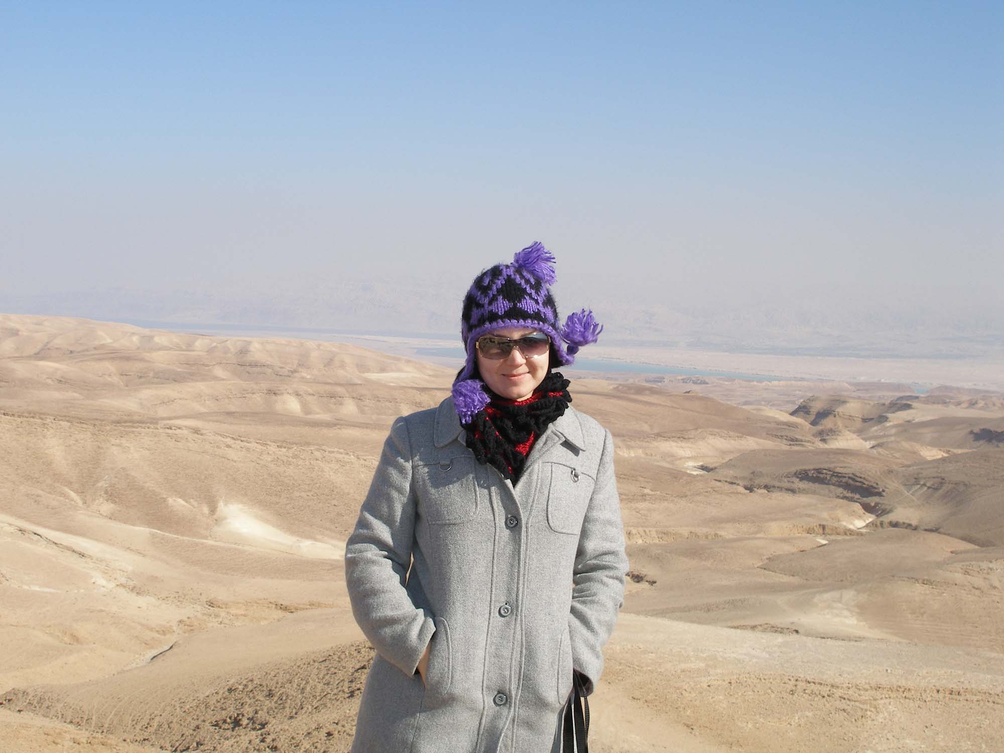 В выходные в пустыне, вдали видно Мертвое море. Жуткий ветер и холодина, видно по бомбошкам и теплое пальто:) Шарф (шарфовая болезнь), уже мой :) подходит к моей шапке :)23 декабря 2006 г.