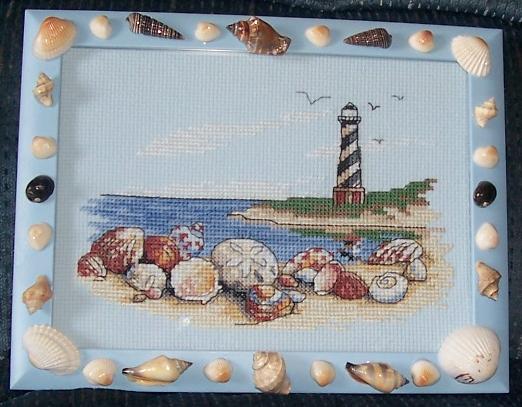 Дизаин от Dimensions, очень понравилсуа процесс, простенький, но симпатичный маячок получился. Рамку украсила ракушками, мне нравится, как в целом выглядит вышивка, в таком оформлении :)12 июля 2007 г.