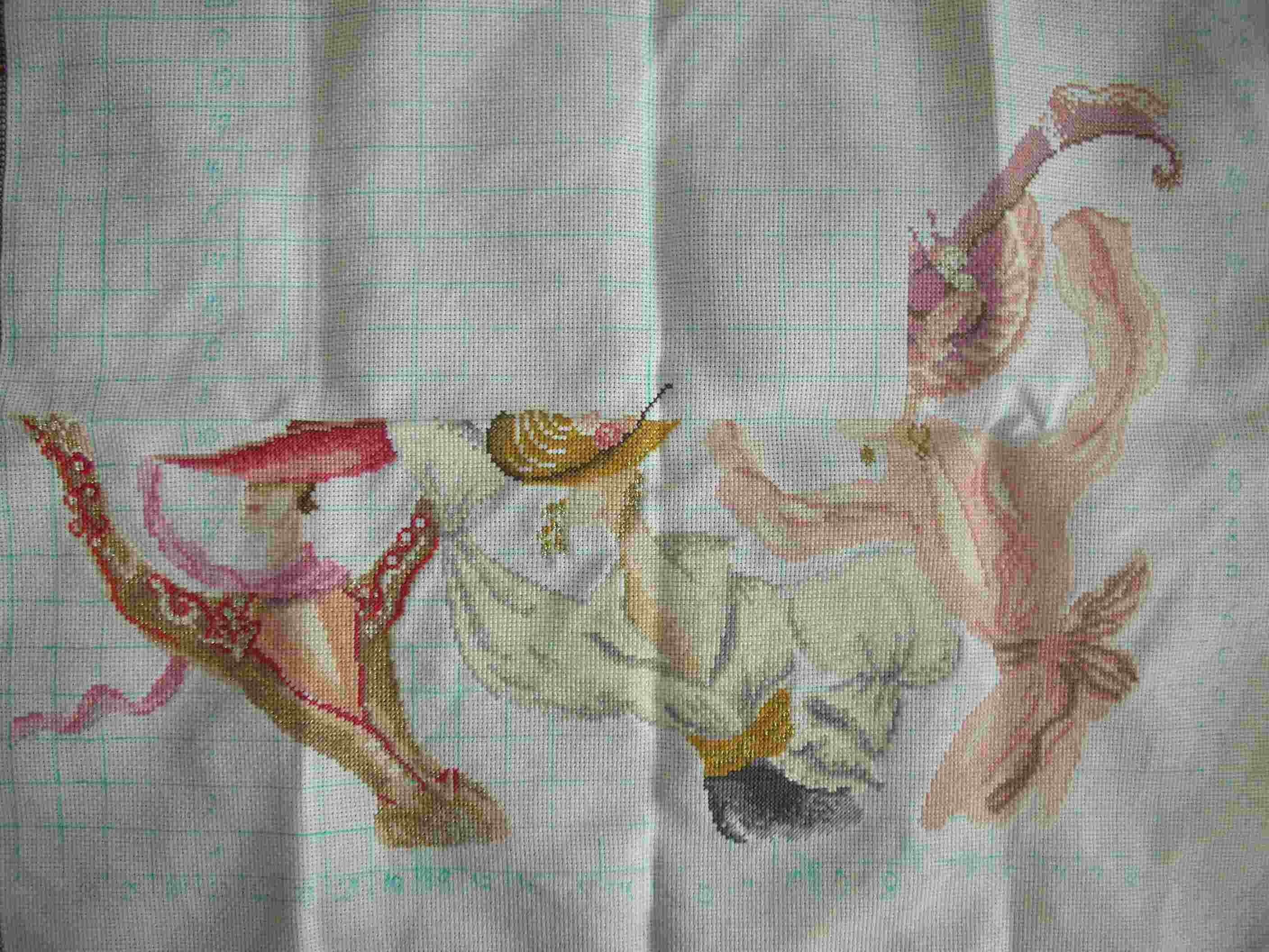 с этой вышивкой у меня не складывается.не правильно расчитала край канвы и оставила очень маленький припуск,и заметила это только когда уже было поздно.Сразу руки опустились и я ее отложила.Изредка берусь.Хочу одним махом закончить и надо пристрочить ткань и закрыть шов паспарту..