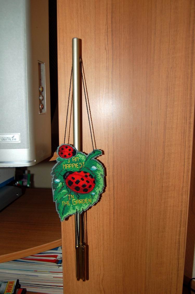 я очень очень ее хотела, но нигде не могла найти, чтобы купить, а Мышка Белая мне ее подарила, за что ей чмок :) вышила очень быстро и сделала тоже. И даже кот ее не трогает, она висит на ручке и радует мой глаз )) летом будет перевешена на окошко, чтобы еще и музыка была :) 10 декабря 2007 г.