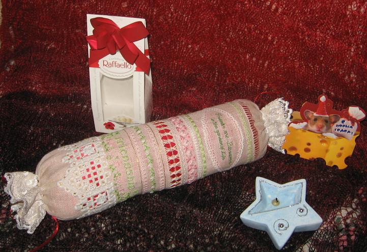 ещё один батончик, нет, красивущий батонище, он портрясающий, а какие слова на нем написаны - я рыдала, честное слово!!! Стеллочка, дорогая, спасибо за необыкновенный подарок!!! От конфет осталась только коробочка (специально сохранила для фотосессии), а свечку зажгла в Рождество!!!! Эх, забыла сфотографировать ещё красивый мягкий шарик на елку, но, Стеллочка, поверь, он висел на елке вместе с Голубкиными подарками - баточиком, Снегурочкой и колокольчиком!!!25 января 2008 г.