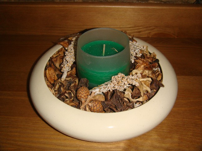 Вот такая композиция получилась у меня из старого керамического блюдца из-под цветов, ароматической свечи и сухоцветов.