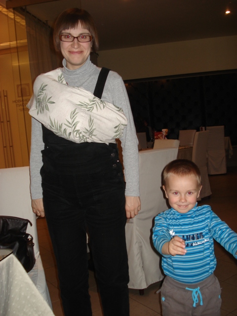 Федор Михайлович в слинге-кармане на маме Юле и с братиком Димой :)13 октября 2008 г.