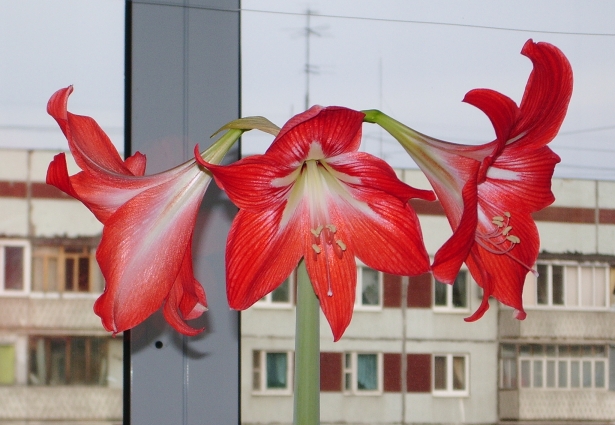 А вот такой гипеаструм зацвёл у меня этой зимой. Я забрала его с работы, где мои коллеги пытались уничтожить растение что только не сливая в его горшок, правда без злых намерений, но цветок чуть не погиб, а дома он ожил и отблагодарил меня26 января 2009 г.