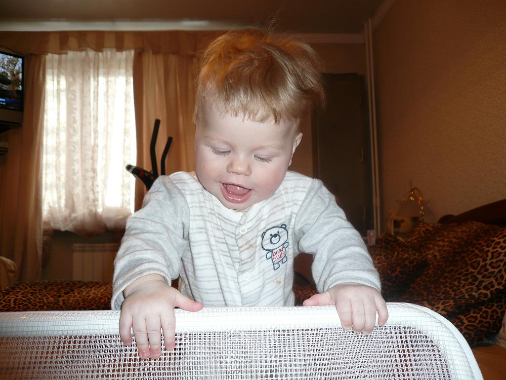 Стоит держась за барьер. 8 месяцев Анютке