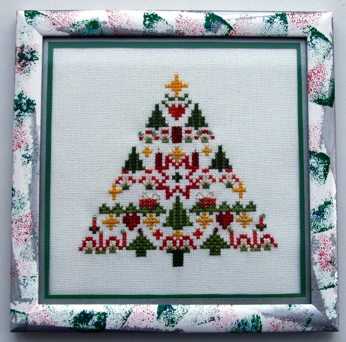 UB design. Вышито на льне, немного металлика и бисера. Размер вышивки 13*13см. Вышивалось очень легко, буквально за 2 вечера. Гораздо больше времени ушло на оформление, хотелось чего-то самодельного. В итоге из белой рамки с помощью акриловых красок и губки получилась вот что. С зеленым цветом не угадала, конечно, этот тон больше к голубой ели бы подошел:), но мне нравится