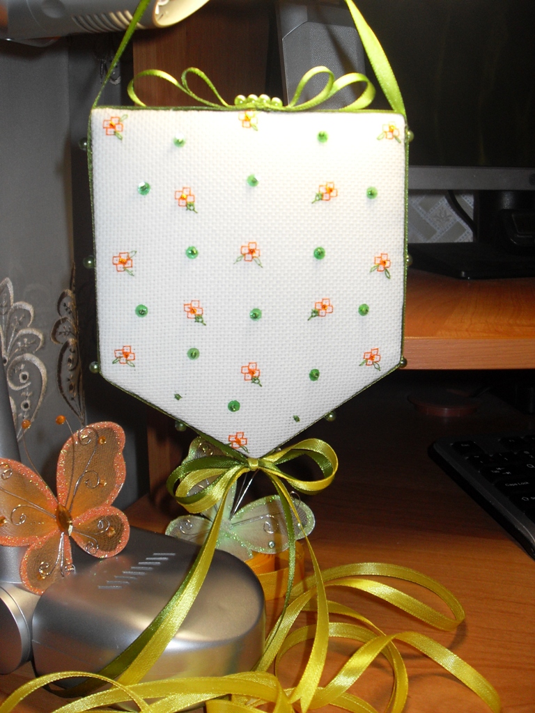 Долго думала, как оформить обратную сторону. Хотела тканькой - не могла подобрать. Широкими лентами - не понравилось. Решила вышить маленькие цветочки и украсила чуть бисером - получилось очень даже ничего! Понравилось! так и оставила! Март 2010 г.