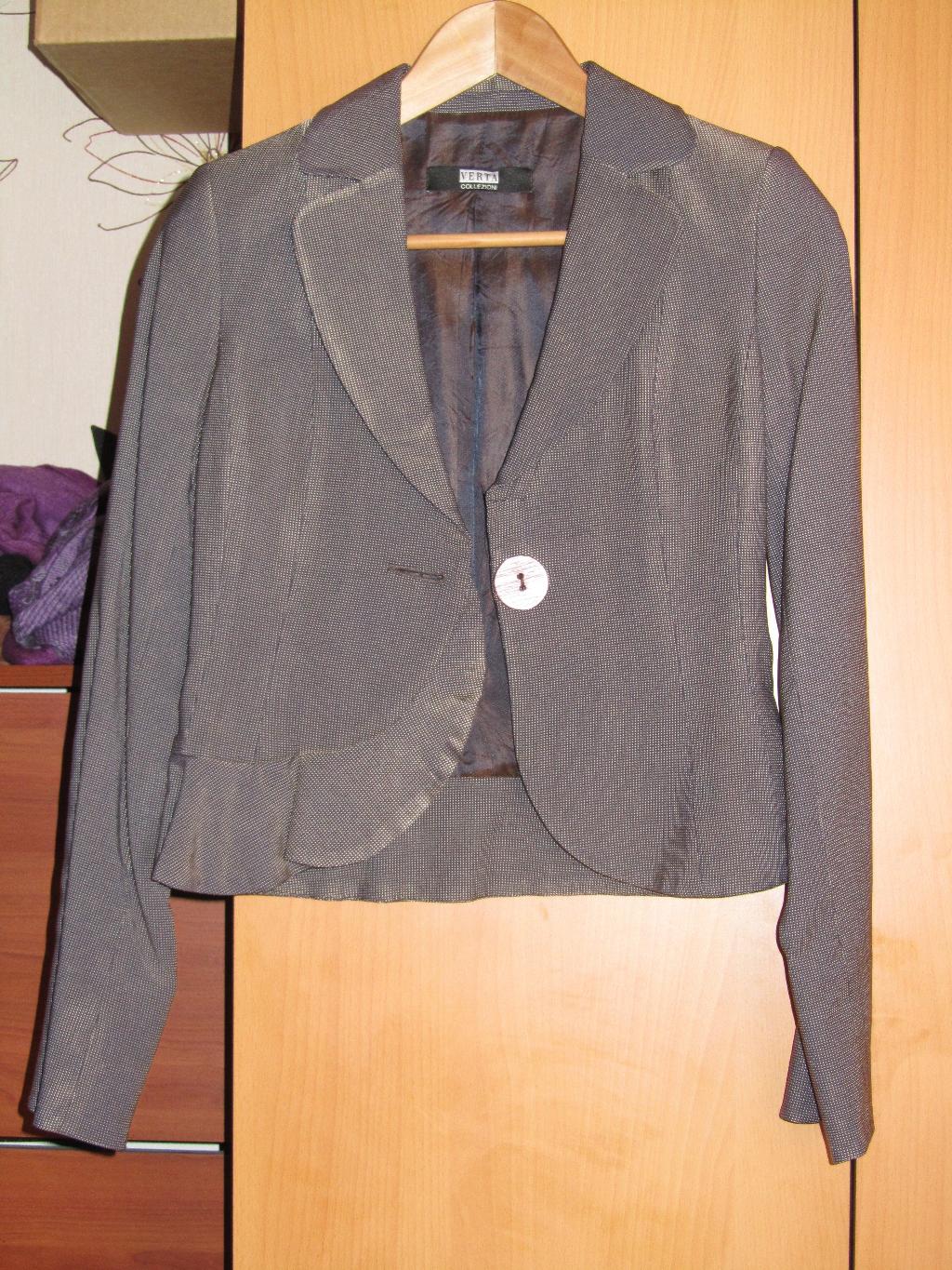 пиджак р. 42 состав шерсть 73% и шелк 24%, эластан 3%. на ОГ 84 было хорошо. растолстела я, не влезаю. носила 2-3 раза. после химчистки.
