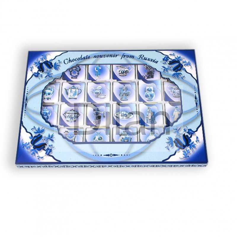 шоколадный набор из 24 5г шоколадок. Сувенир из серии, посвященной народным промыслам России. На каждой этикетке – изящные изделия из знаменитой гжельской коллекции. На оборотной стороне коробки – история старинного гончарного района – Гжель.