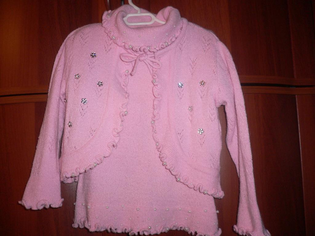 Комплект состоит из кофточки с коротким рукавом и болеро. Украшен бусинками под жемчук и цветочками.