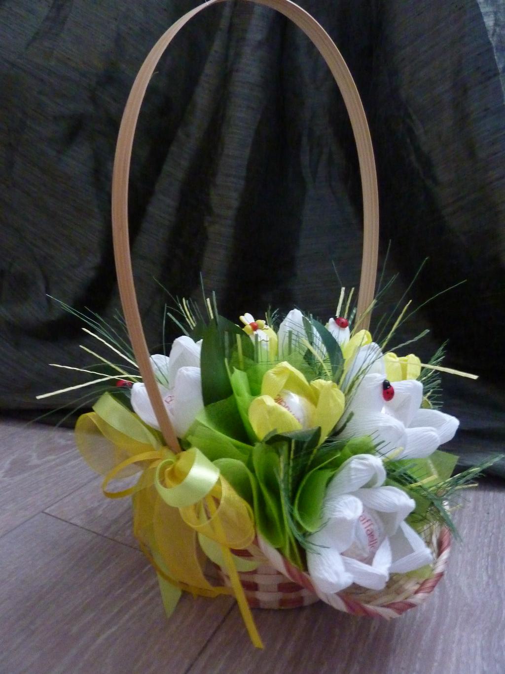 КОРЗИНОЧКА С КРОКУСАМИ: 9 ШТ С РАФАЭЛЛО.. . БУКЕТЫ ИЗ КОНФЕТ И НЕ ТОЛЬКО