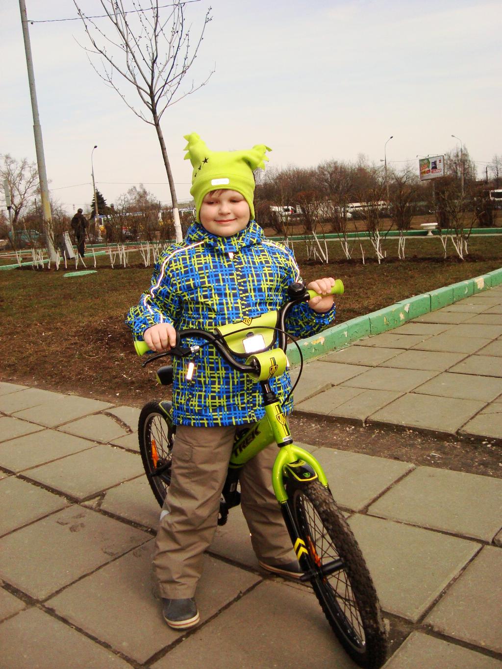 Куртка Mot*ons коллекция весна-лето 2012 разм. 140, штаны из прошлогодней коллекции разм. 128, шапка Джо колл. весна-лето 2012, за все спасибо оргу Galka. На ногах кроксы из ЗШ, спасибо Юле zanozza. Велосипед Тр*к 20", спасибище оргу МУРКА. Ребенок ростом 128.