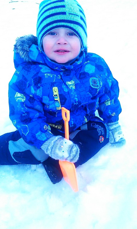 Первая прогулка уже в Москве. Особо и не ходил на улице - норовил упасть и посидеть. Думаю, это был первый зимний выход в его жизни)