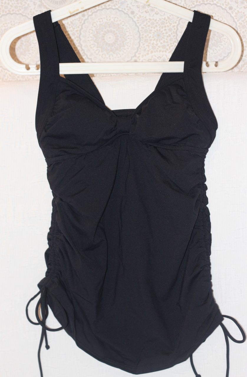 Танкини Landsend Women's Regular Beach Living Adjustable Tunic Swim Top. Очень хорошего качества, и смотрится отлично! Размер 2. (На наш 42-44). Встроенные чашечки - хорошо формируют грудь, по бокам стяжки-шнурочки, можно разной длины сделать. Цвет черный. Можно подобрать плавки любого цветы.