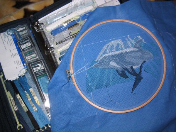 Вышиваю дельфинчиков только во время поездок куда-нибудь. Процесс идет легко, хотя и медленно в силу того, что последнее время мало куда выбираемся.22 апреля 2004 г.