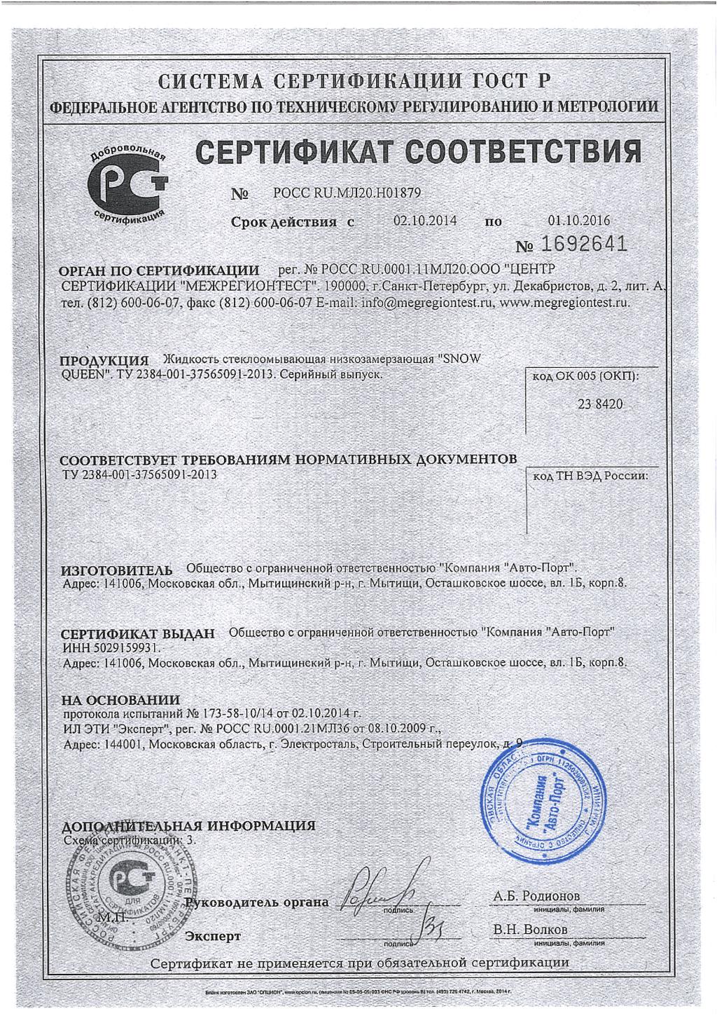 Сертификат соответсвия на незамерзайку