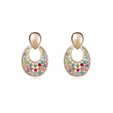 В этих стильных сережках подвесами служат позолоченные полумесяцы или подковки. Чтобы обыграть такую изящную и простую форму, ювелир украсил их россыпью разноцветных кристаллов Swarovski, которые ярко смотрятся на желтой позолоте. Такие сережки подойдут девушкам, предпочитающим в украшениях современную трактовку классического дизайна.