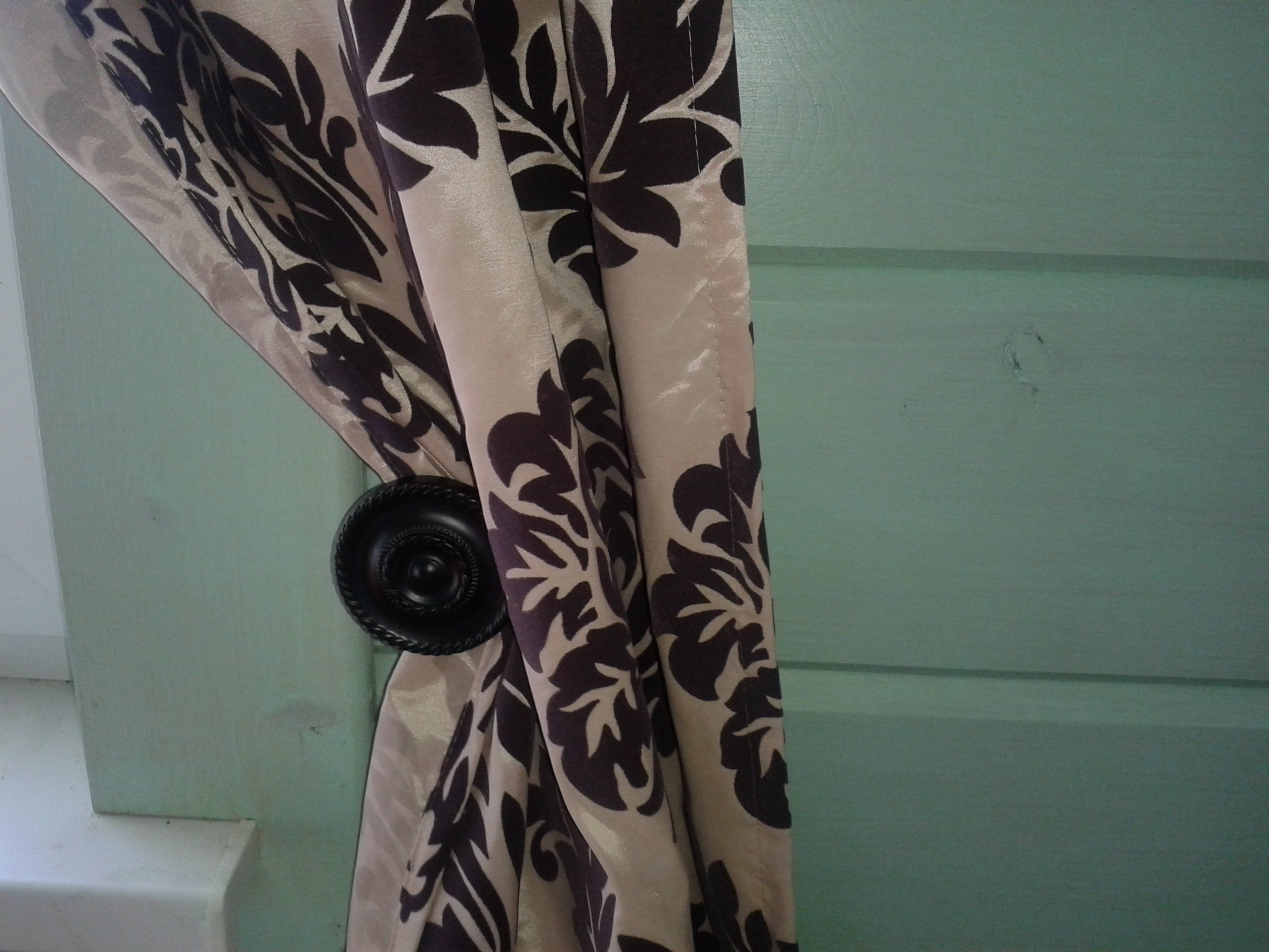 Пока так повесила, но задумка - сделать широкую черно-коричневую ленту, которой подхватывать штору