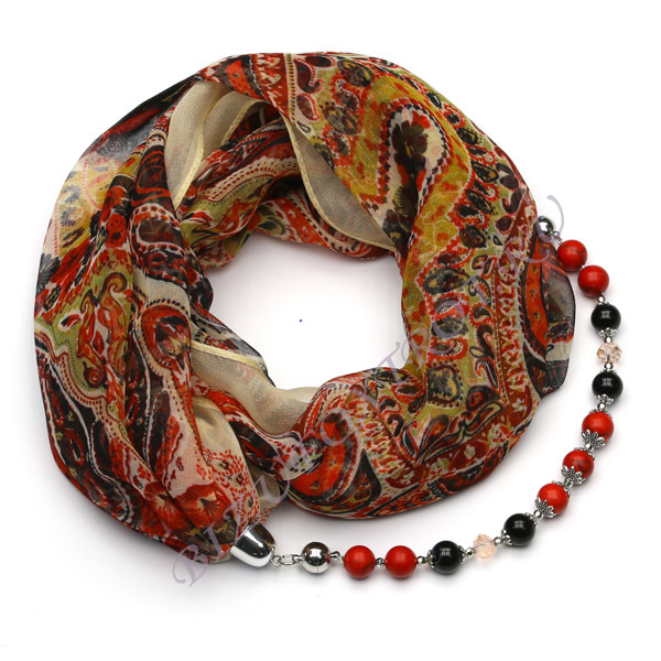 Модель 2 в 1. Шифоновый платок, размером 85см*85 см, сложен в шарф и украшен нитью из натуральных камней, которая прикрепляется к нему с помощью магнитов. Нить из камней легко трансформируется в браслет, что образует прекрасный оригинальный комплект: платок+браслет. Длина браслета 22 см.