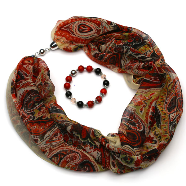 Модель 2 в 1. Шифоновый платок, размером 85см*85 см, сложен в шарф и украшен нитью из натуральных камней, которая прикрепляется к нему с помощью магнитов. Нить из камней легко трансформируется в браслет, что образует прекрасный оригинальный комплект: платок+браслет. Длина браслета 22 см.