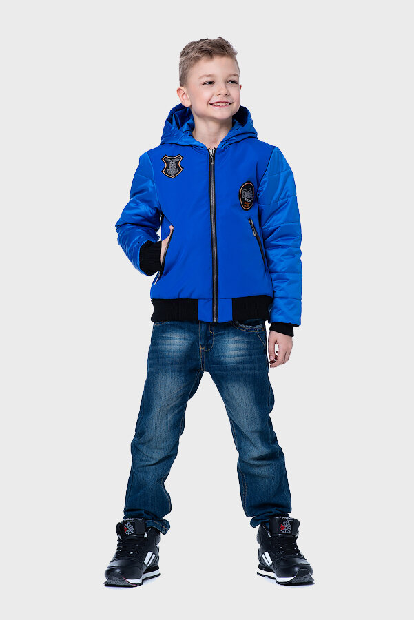 Куртка-бомбер для мальчика отлично подойдет для долгих весенних прогулок. Удобный капюшон защитит от дождя, а трикотажные манжеты на рукавах и нижней части бомбера защитят от ветра. Куртка декарирована нашивками, которые актуальны в этом сезоне. Идеальный вариант для юного модника.