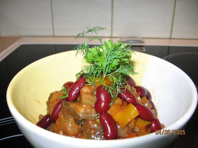 Баклажаны и все овощи( сладкий перец, морковь,помидоры, грибы, или мясо), обжарить по отдельности. Добавить тертый чеснок, фасоль консервированная,зелень. Сделать заправка из томат-пасты как на борщ. И поставить на медленный огонь тущиться 20-25 минут.19 августа 2005 г.