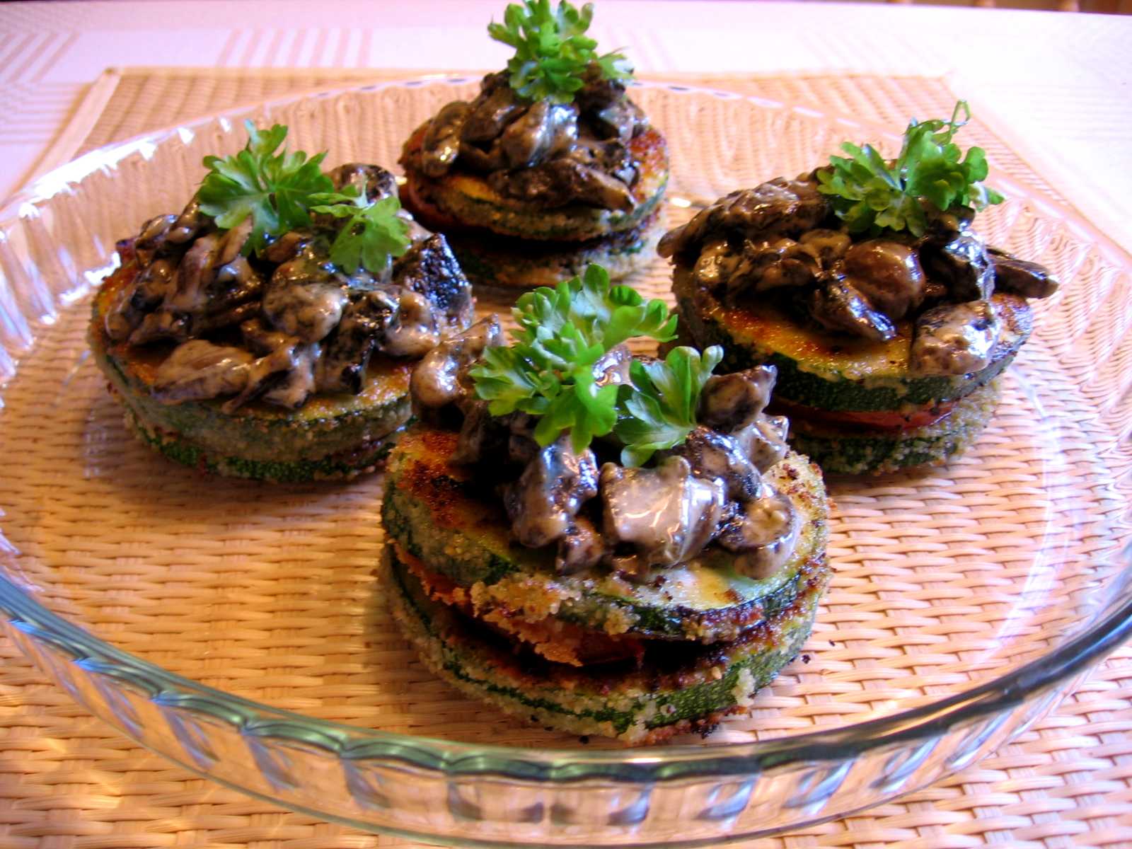 кабачки обвалять в яйце и панировочных сухарях, обжарить с двух сторон. Помидоры нарезать кружочками обжарить. Грибы обжарить в сметане. Выложить: кабачок, помидор, кабачок, грибы. Специи по вкусу.