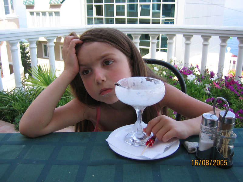 Машка страдает над мороженым: то ли еще заказать. то ли спать лечь...Август 2005 г.